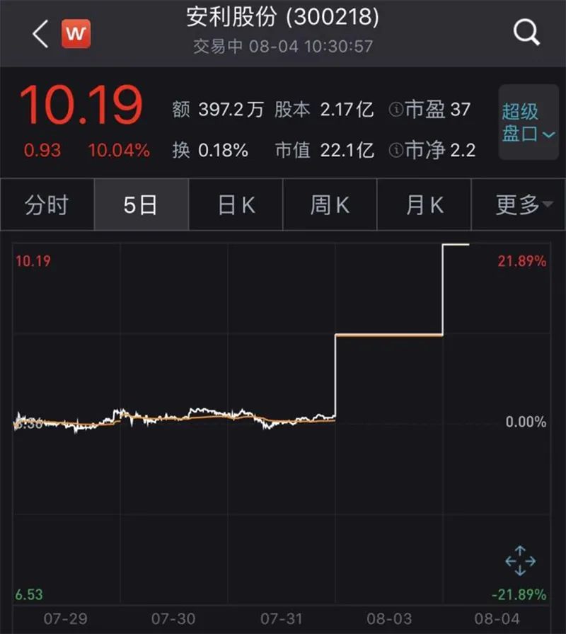 安利股份8月3日开盘即涨停,今日延续强势,开盘继续一字板。