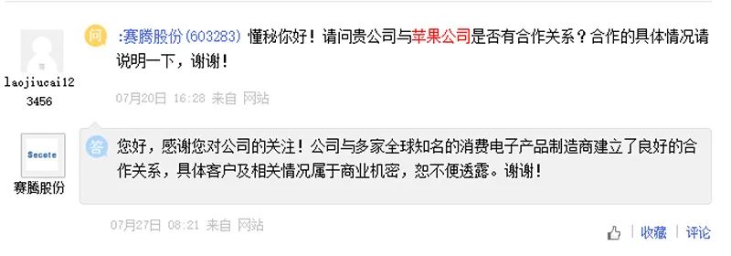 还有公司模糊回应。比如赛腾股份,仅披露其与多家全球知名消费电子产品制造商建立良好合作。