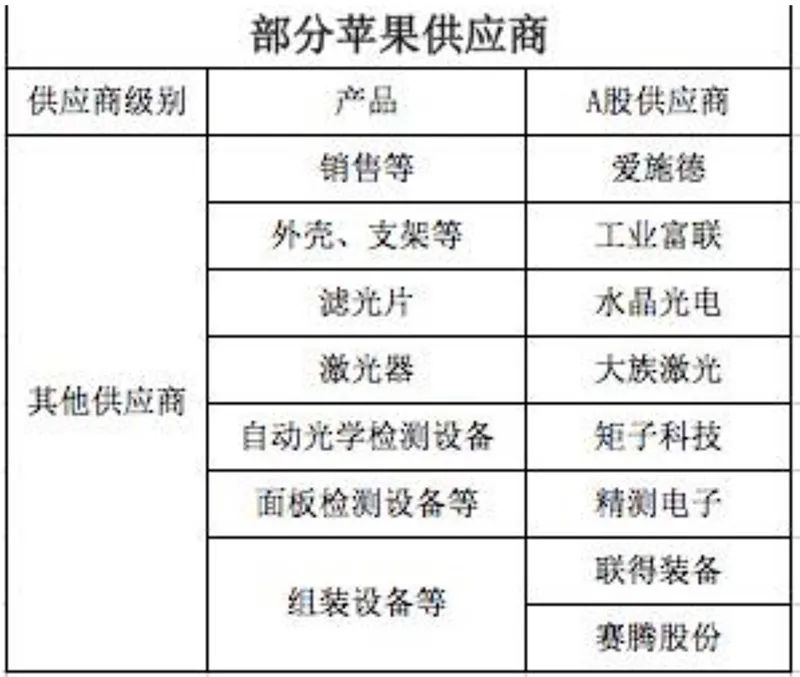 此外,上证报记者查阅,苹果还有部分“间接”核心供应商,比如为苹果代工商富士康、和硕等提供AOI(自动光学检测)设备的矩子科技,通过三星进入其面板检测供应商体系的精测电子等。
