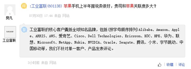 工业富联在互动易披露,公司的核心客户包括Alibaba(阿里)、Amazon(亚马逊)、Apple(苹果)、华为等。