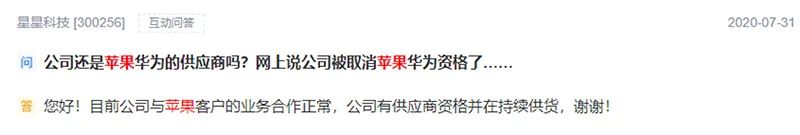 针对被取消供应商资格传闻,星星科技披露,公司与苹果的业务合作正常,公司有供应商资格并在持续供货。