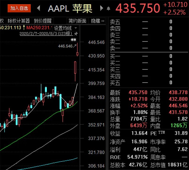 因最新一季财报数据超预期,苹果股价周一延续上周涨势,上涨2.52%至435.75美元。