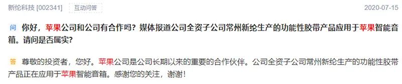 新纶科技表示,苹果是公司长期以来重要的合作伙伴,公司全资子公司常州新纶生产的功能性胶带应用在苹果智能音箱。