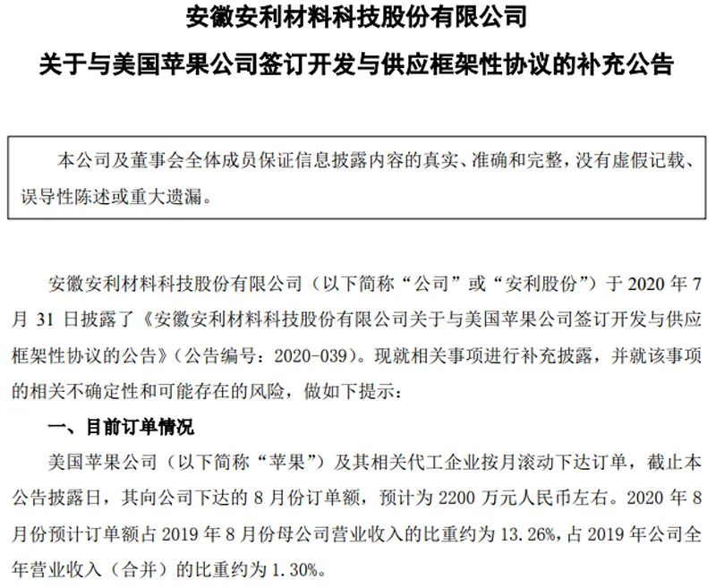 安利股份就在8月4日披露,其与苹果签订了开发与供应框架性协议的补充协议,苹果下达的8月份订单预计为2200万元,预计占公司2019年8月营收的13.26%,占2019年营收的1.3%。