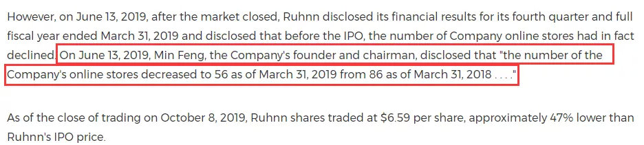 另一家律师事务所Kaplan Fox & Kilsheimer LLP在声明中称,如涵控股在招股书中称,该公司网店的数量一直在增长,已从2017年3月31日的57家,增至2018年3月31日的86家。但是在如涵控股2019年6月13日发布盘后财报时,这家公司却披露在截至2019年3月31日的第四财季,也就是上市之前的一个财季,该公司的网店数量实际上是下滑的。