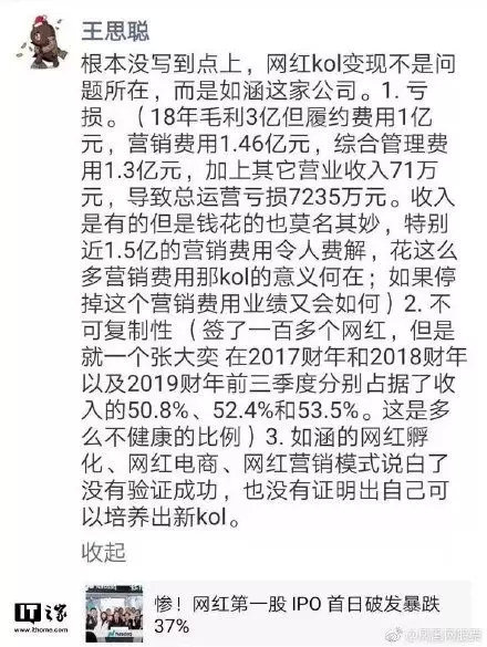 王思聪认为如涵存在以下三个问题:1.1.5亿的营销费用令人费解2.平台营收过于依赖超级网红带货,但是后者的打造不可复制。3.如涵无法证明自己可以培养新的KOL。