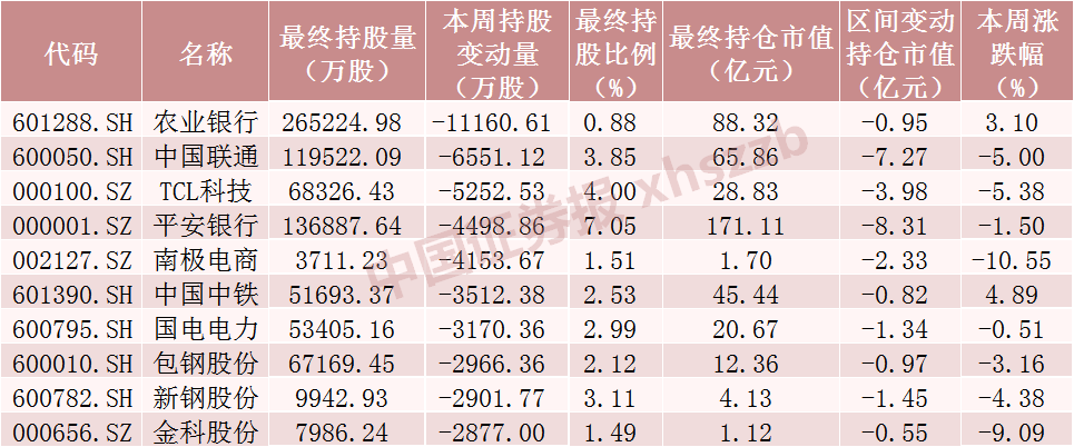 本周持仓市值减少额前十的股票中,隆基绿能、立讯精密、紫金矿业、通威股份被北向资金减仓超1500万股。