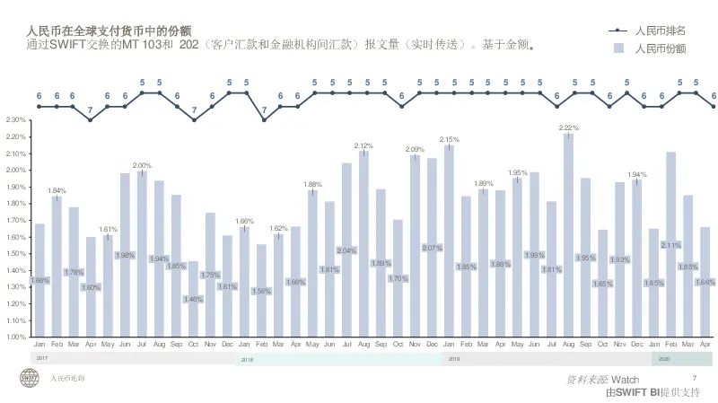 另据环球银行金融电信协会(SWIFT)最新统计数据显示,2020年4月,在基于金额统计的全球支付货币排名中,人民币下降至全球第六大最活跃货币,占比1.66%。与2020年3月相比,人民币支付金额总体减少了25.09%,同时所有货币支付金额总体减少16.56%。