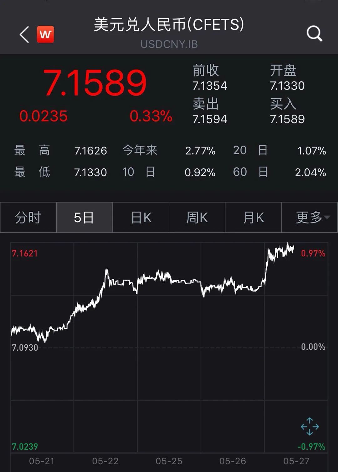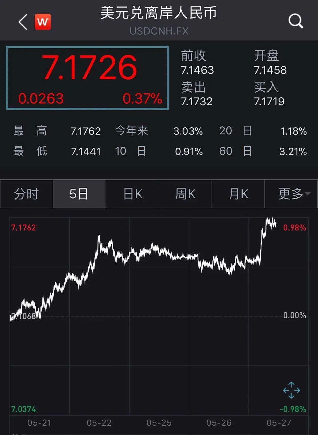5月27日,离岸人民币兑美元汇率跌幅进一步扩大,日内一度跌超300点,最低报7.1759,创2019年9月以来新低。截至记者发稿,在岸人民币兑美元汇率跌超200点至7.15上方。