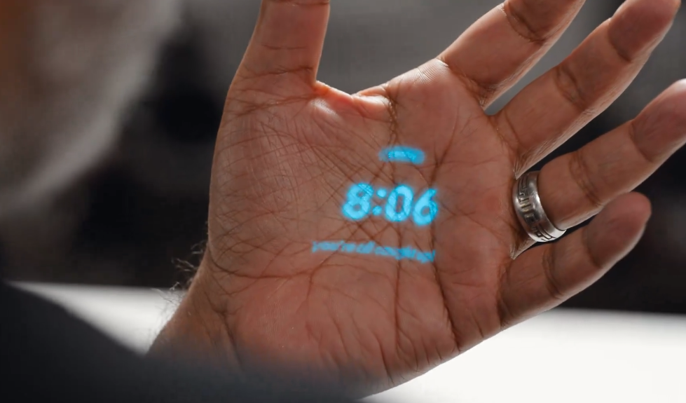 与先前科技媒体爆料的基本一致,这款小巧的设备没有配备屏幕,而是使用了“激光墨水显示”这个“革命性的设计”。简而言之,就是 Ai Pin可以通过激光束在手掌中投影,“将你的手变成文本、图形等元素的画布。”