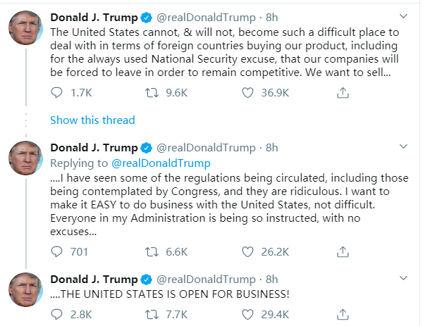 他表示,“美国不能,也不会成为一个难做生意的国家,包括总是以美国国家安全为借口在内,我们的公司为保持竞争力因此而离开美国。我们的产品要卖给中国和其他国家,这是贸易的全部。