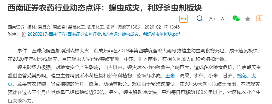 多家券商、期货公司纷纷拿出研报分析称,若蝗虫灾害继续在全球蔓延,将推高全球农产品价格,国内农业板块上市公司或将受益,对消灭蝗虫的农药类企业也将形成利好。