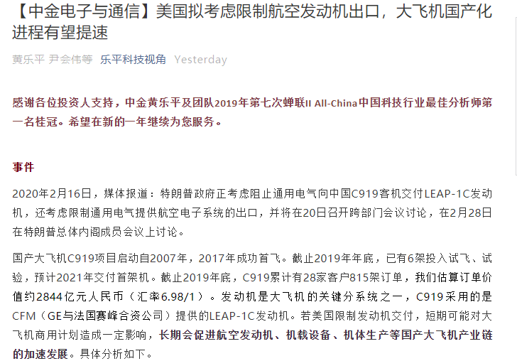 在此之前,中金公司电子与通信团队发布《美国拟考虑限制航空发动机出口,大飞机国产化进程有望提速》的研报,提出若美国限制发动机交付,短期可能对大飞机商用计划造成一定影响,长期会促进航空发动机、机载设备、机体生产等国产大飞机产业链的加速发展。