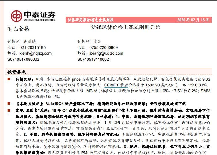 中泰证券2月16日发表的研报称,2020 年百舸争流,是有色投资机会大年。新能源上游原材料钴锂铜箔磁材等则会迎来3年景气上行周期,坚定看好。