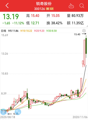 涨幅最高的是锐奇股份,累计涨幅达到62.24%。此次大涨之前,锐奇股份并没有受到太多资金关注,股价走势也相对平淡。锐奇股份在股价异常波动公告中表示,公司当前的滚动市盈率与同行业有显著差异,近期经营情况及内外部经营环境未发生重大变化。今日早间,锐奇股份收到深交所关注函,要求公司结合股价涨幅、市盈率与同行业可比上市公司的偏离情况等进一步提示投资风险。锐奇股份今日高开回落,尾盘收跌11.12%。