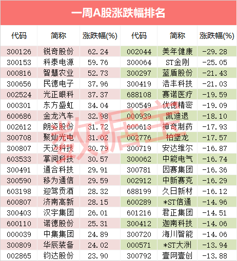在过去的五个交易日里,哪些黑马股脱颖而出?证券时报·数据宝统计显示,剔除近一个月上市的次新股,本周涨幅前五位的是锐奇股份、科泰电源、智慧农业、民德电子、光正眼科。
