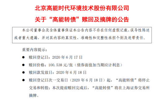 26日晚间,高能环境发布公告显示,将于6月18日赎回高能转债,赎回价格为100.538元/张(债券面值加当期应计利息)。