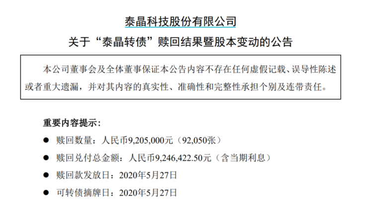200多万不要了,谁这么壕?超9万张泰晶转债未转股