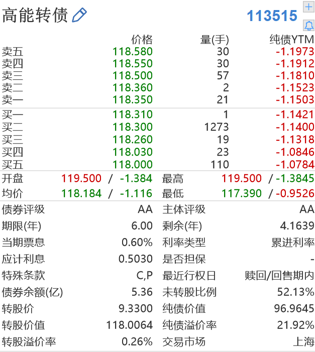 也就是说,6月17日收市后,高能转债将停止交易和转股。截至5月26日,高能转债转股价值为118元,转股溢价率接近零,有超50%的高能转债未被转股。投资者要抓紧了。