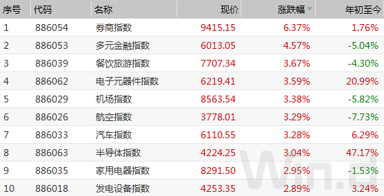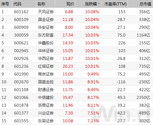 从板块个股涨幅来看,天风证券、国金证券、华安证券、华鑫股份、华林证券等近10只券商股涨停,此外,其他个股亦大幅上涨。