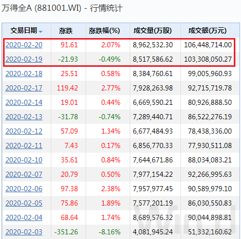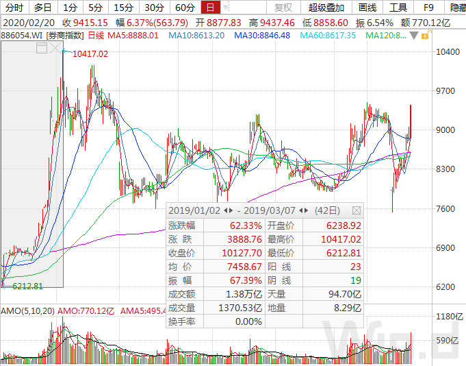 2月20日, A股成交额再度突破万亿大关,券商板块批量涨停。