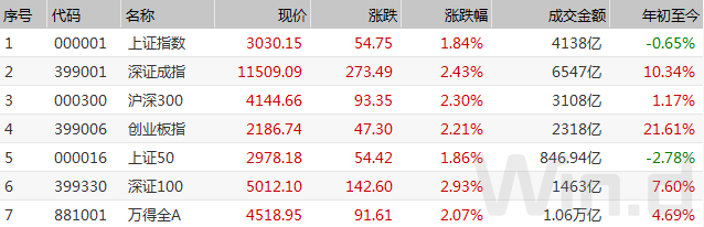 2月20日,沪深两市大幅上涨,截至收盘,上证综指涨1.84%报收于3030.15点;深成指涨2.43%报收于11509.09点;创业板指涨2.21%报收于2186.74点,万得全A总成交逾1万亿元,再创近期新高。