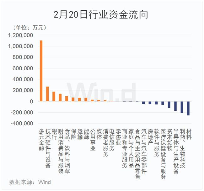 从2月20行业主力资金流向来看,主力资金净流入100多亿元。其中,多元金融净流入超100亿元,位居第一,相比其他板块大幅领先;此外,技术硬件与设备、银行板块亦小幅流入,仅材料、生物制药、半导体等板块小幅流出。整体看,净流入板块数略多于净流出板块数。