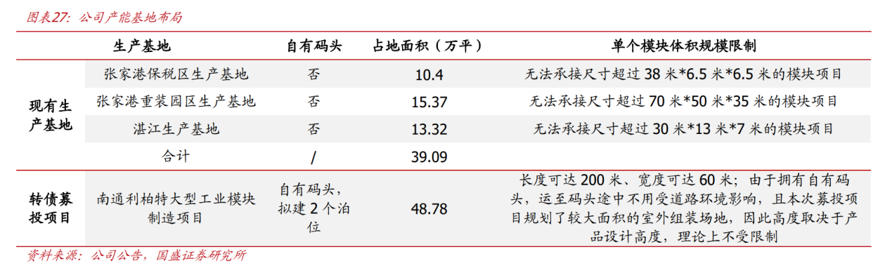 南通基地占地面积大幅增加,可支撑更大体积单体模块建设。南通利柏特基地位于通州湾示范区,毗邻长江入洋口,占地面积48.8万平米,系公司目前最主要模块生产基地张家港重装园区生产基地占地面积的3.17倍,可支撑更大体积单体模块建设(长度/宽度最大分别达200/60米,且由于此次规划较大面积室外组装场地,高度理论不受限制),同时可规划多个模块同建造(以此前公司承建的YINSON浮式生产储气轮上部模块项目为例,该项目由5个模块组成,张家港重装园区生产基地可同时规划10个类似模块,南通基地可同时规划35-40个)。此外,南通项目配备自有码头,可实现模块产品直接出运,无需等待公共码头排期,有望大幅提升场地周转率。