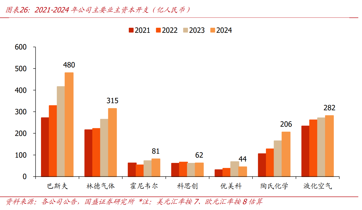 下游积累丰富优质客户资源,核心业主资本发支相对稳健。依托领先技术实力及工艺Know-how积累,公司与巴斯夫、林德开体、科思创、优美科、陶氏化学、液化空开、英威达等大型跨国化工企业建立稳定合作关系,此类客户具有严格供应商遴选制度,出于对化工模块安全性、稳定性考虑,不会轻易更换供应商,公司深入了解其工艺流程,未来有望延续与其长期合作。且大型跨国化工龙头通常具备较长远投资计划,近年来受宏观环境影响,资本发支增速虽有所放缓,但总体仍维持较大体量,叠加模块化渗透率持续提升,有望为公司主业提供稳定订单来源。