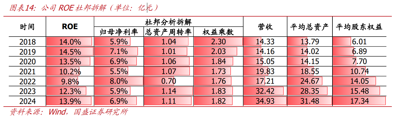 近三年ROE明显回升,显著优于同业公司。2018-2021年受负债率下行影响,公司ROE有所承压,2022年起资产负债率基本稳定,叠加在手订单步转化,总资产周转率及净利率同上行,带动ROE回升。2024年公司综合ROE达13.9%,杜邦拆解看:归母净利率6.9%,同增1pct;总资产周转率1.11、权益乘数1.82,同比基本持平,整体ROE水平显著高于同业。