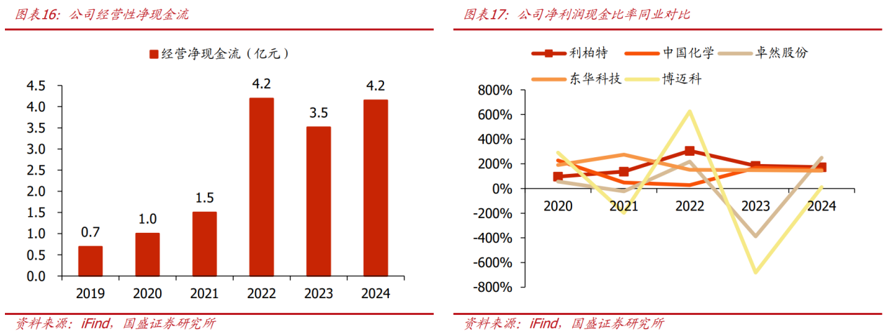 业务回款情况优,净利润现金比率优于同业。公司客户多为大型跨国企业(巴斯夫、英威达等),资信情况普遍较优,项目回款情况良好,2022-2024年经营性净现金流分别为4.2/3.5/4.2亿元,净现比为306%/185%/173%,现金流维持大额净流入,且明显优于同业可比公司,表现持续优异。