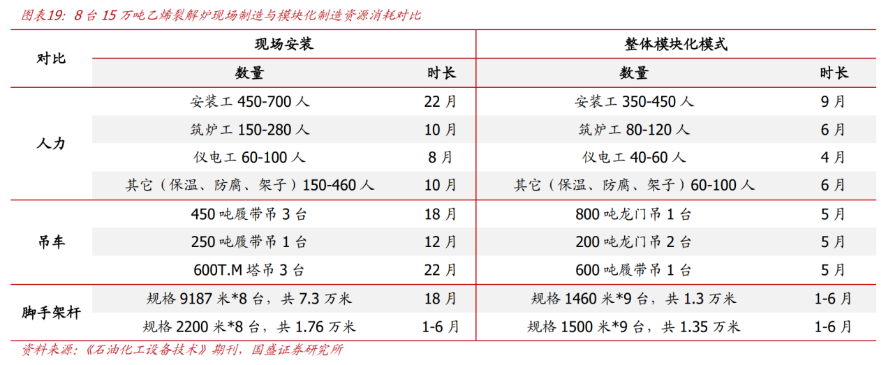 1)缩短工期,节约综合成本。模块化建造通过工厂预制、预组装代替传统工程施工模式,可大幅压缩项目建设周期、加快投产进度。以中国石气承建的新疆独山子石化分公司8台15万吨乙烯裂解炉为例,对比现场安装模式,采用模块化建造下平均单台裂解炉建造施工成本减少约260万元。