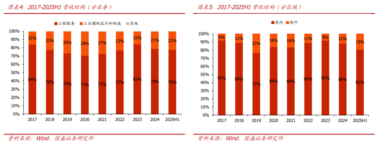 EPFCO贡献主要收入,模块业务外销占比过半。从公告口径看,公司主营业务分为工程服务(EPFCO)、模块设计制造两大板块,2024年收入占比分别为79%/21%,其中模块业务仅涉及单体模块制造及交付,总承包项目中涉及的模块化环节不计入该业务口径。2025H1工程服务/模块制造分别实现营收11.2/3.2亿元,同降23%/8%,占比78%/22%。分区域看,公司2024年公司境内/境外收入分别占比88%/12%,其中洋外收入均来自模块出口业务,2024年模块业务中内销/外销占比分别约45%/55%。