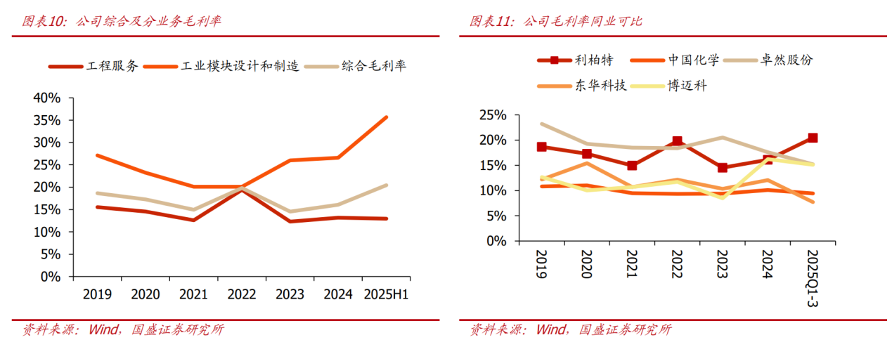 盈利能力领先同业,现金流持续优异。Q1-3毛利率显著提升,盈利能力优于同业。2021年以来公司毛利率维持在15%-20%区间,显著高于中国化学、东华科技等化工EPC龙头,盈利能力优异。2024年公司综合毛利率16.1%,同增1.5pct,主要得益于毛利率相对较高的工业模块业务占比显著提升。分业务看:2024年工程服务/工业模块毛利率分别为13.2%/26.6%,同增0.9/0.6pct,其中工业模块毛利率近两年显著提升,预计主要因公司承接项目多为技术含量高、生产过程复杂的大型模块产品,存在较强设计壁垒,盈利性相对较优。后续随着南通利柏特基地产能步释放,模块业务占比有望持续提升,带动综合毛利率上行。