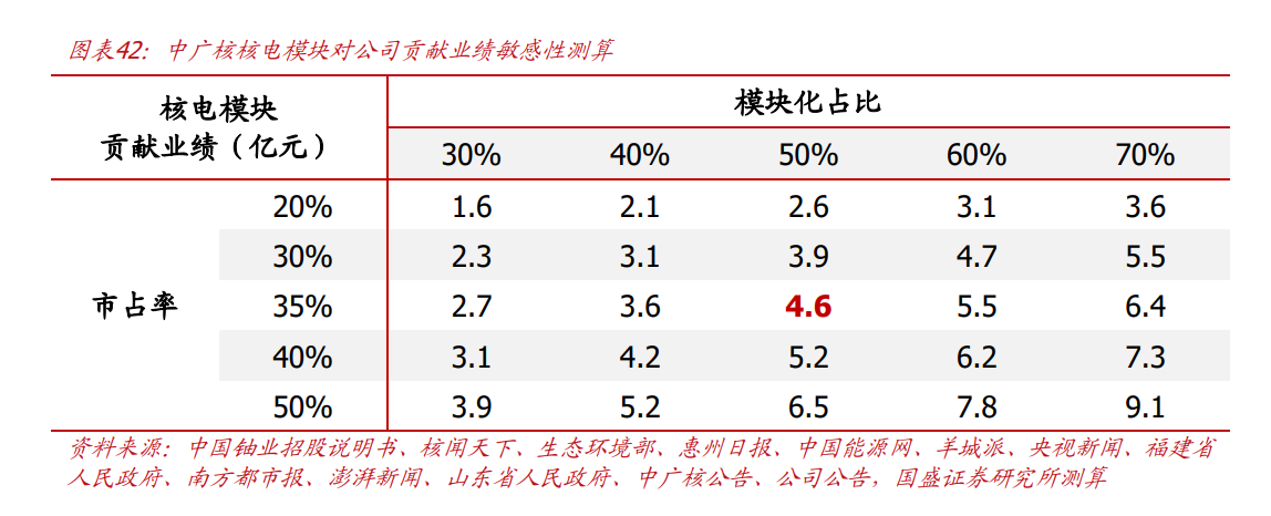 3)公司市占率:由于核电工程对安全质量要求极高,预计产业链各环节均有较严格供应商名录。模块化系核电领域新型建造方式,当前公司已有中广核模块订单落地,后续预计将在其体系内占有较高份额,我们按照20%-50%市占率进行敏感性测算(中值35%)。