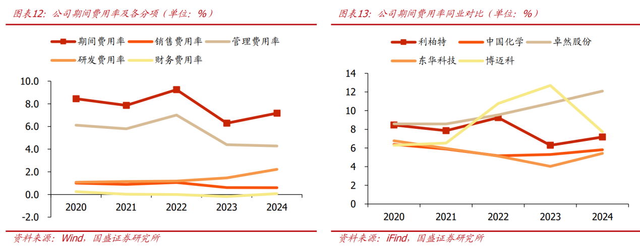 期间费用率总体呈下行趋势,费率水平处同业中上游。公司期间费用率变动主要受管理费用影响,2023年受益营收快速扩张,职工薪酬等刚性成本下行,管理费用率明显降低,带动整体期间费率下行。2024年公司期间费用率7.2%,同比提升0.9pct,其中销售/管理/研)/财务费用率分别为0.6%/4.3%/2.2%/0.1%,同比持平/-0.1/+0.8/+0.3pct,研)费率同比提升较多,主要因公司加大对大型装置模块化相关的节能降耗、安全环保、自动化等工艺技术研)投入,总体费率水平处同业中上游。
