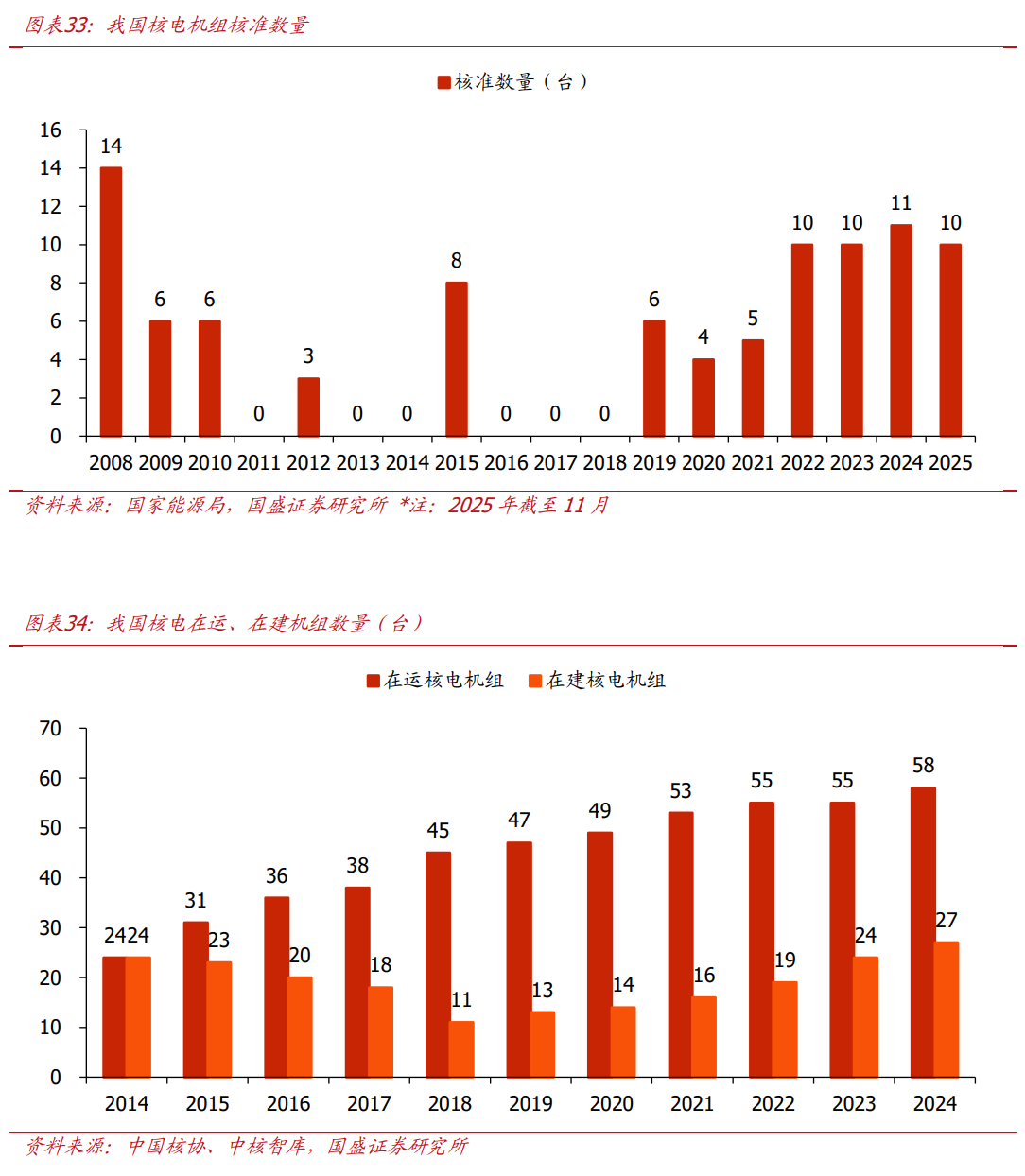 2022年起我国核电核准数量步渐回暖,扩张信号明确。2011年日本福岛核事故后我国暂停新增核电项目审批,直到2012年12月才核准江苏田湾核电二期工程,2013-2014年无新项目获批。2015年核电审批重新放发,当年共核准8台核电机组,此后的2016-2018审批再次中断,未有新项目过审。2019年中国核电审批再次重启,我国核电业务重新走上快速)展轨道,2022-2025年((截至2025年11月)核电机组核准数分别为10、10、11、10台,核准数量显著回暖,步稳定在每年10台机组左右,行业扩张信号明确。