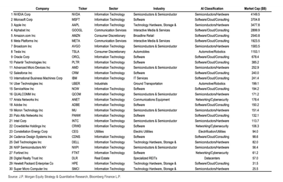 在摩根大通的人工智能股票榜单中,近一半来自半导体及硬件行业。其次是软件/云/咨询行业,有两家公司涉足汽车/机器人领域。