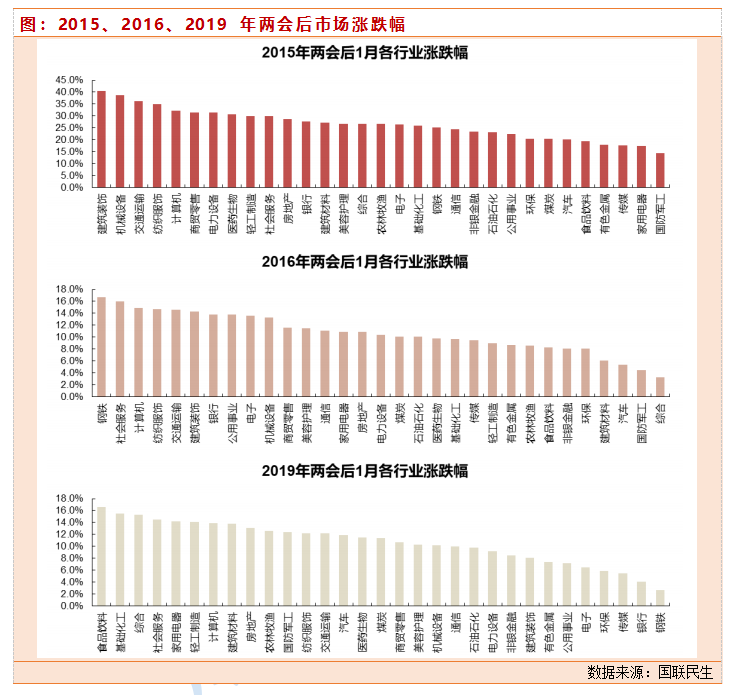 历年春节后到两会前,市场往往持续上涨,小盘明显强于大盘。两会期间,市场往往会产生调整;两会后,市场整体偏稳定,各年之间有明显分化。结构上,两会后,行业间有所分化,TMT行情可能优先修复,随后地产链等顺周期资产可能补涨。