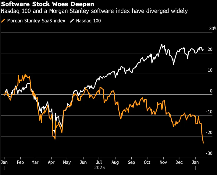 根据业内汇编的数据,摩根士丹利追踪的一组软件即服务(SaaS)股票在去年下跌11%的基础上,今年以来又下跌了15%——这是自2022年以来最糟糕的年度开局。