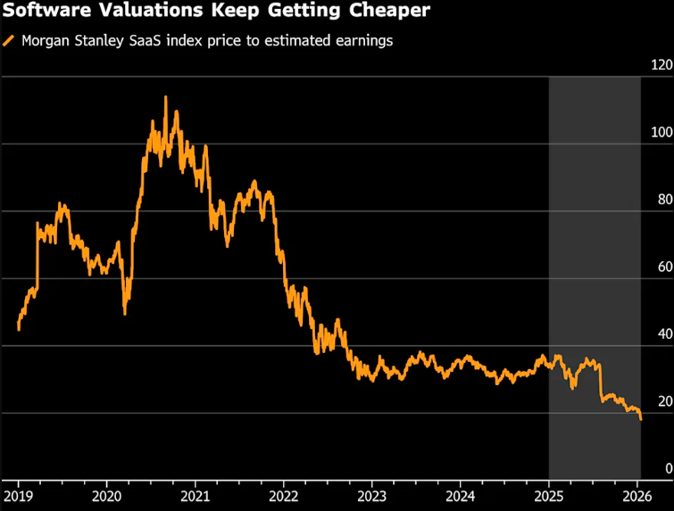 与此同时,软件公司的估值正在变得越来越便宜。摩根士丹利的一篮子股票价格对应未来12个月预测收益的远期市盈率为18倍,创历史新低,远低于过去十年超过55倍的平均水平。
