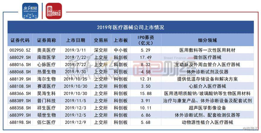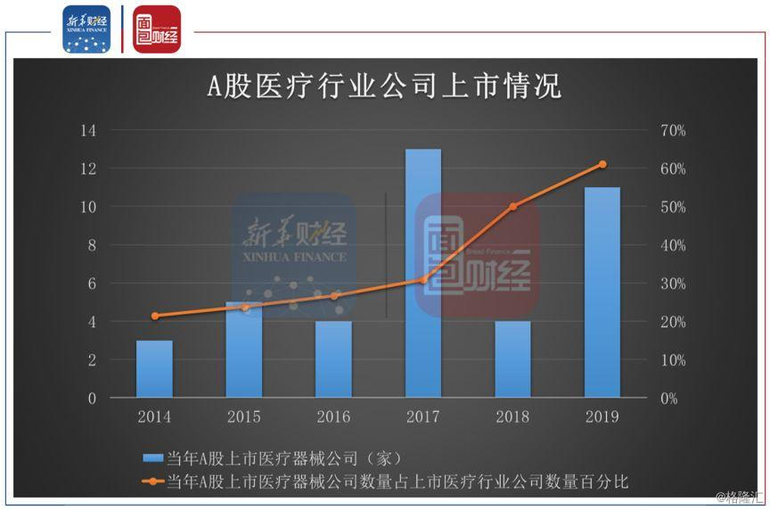 新华财经和面包财经的研究发现,2019年是医疗器械公司集体冲刺资本市场的大年,11家公司在A股成功上市,占当年医疗行业新上市公司数量的六成。