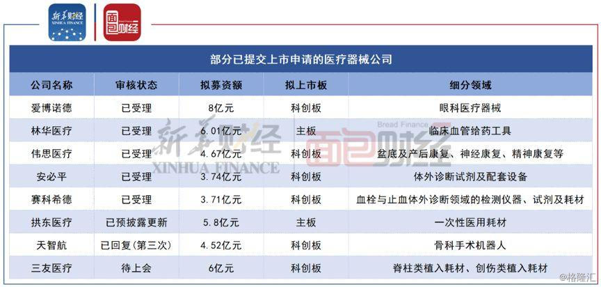 新华财经和面包财经研究员的统计显示,仅2019年12月份,就有5家医疗器械公司新提交上市申请,分别是爱博诺德、林华医疗、伟思医疗、安必平和赛科希德。