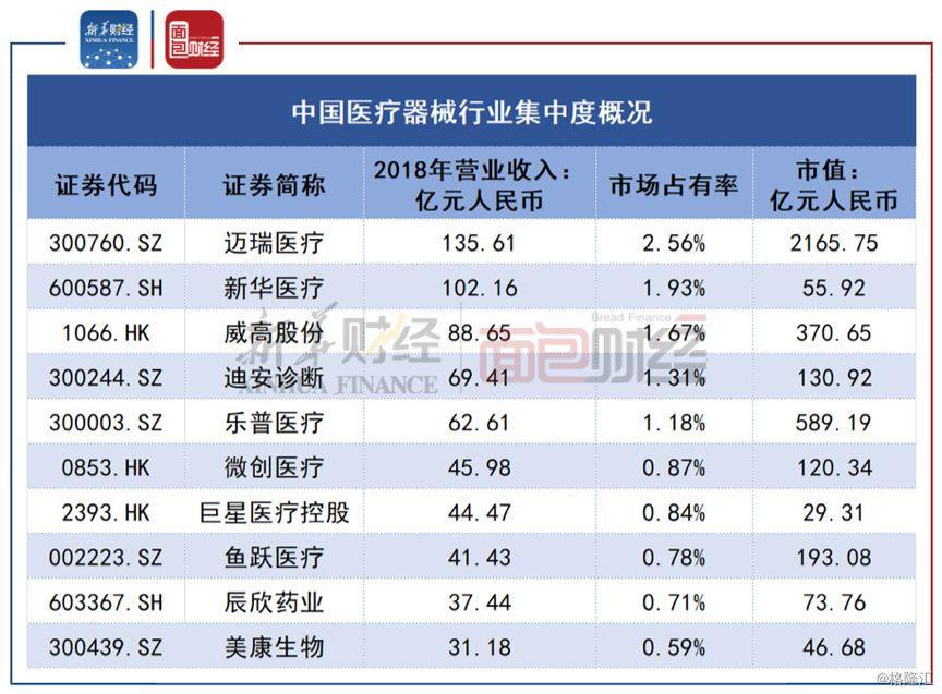 新华财经和面包财经研究员梳理医疗器械行业市场情况发现,尽管行业内已经出现多家收入超过50亿元的上市公司,但行业集中度仍然不高。