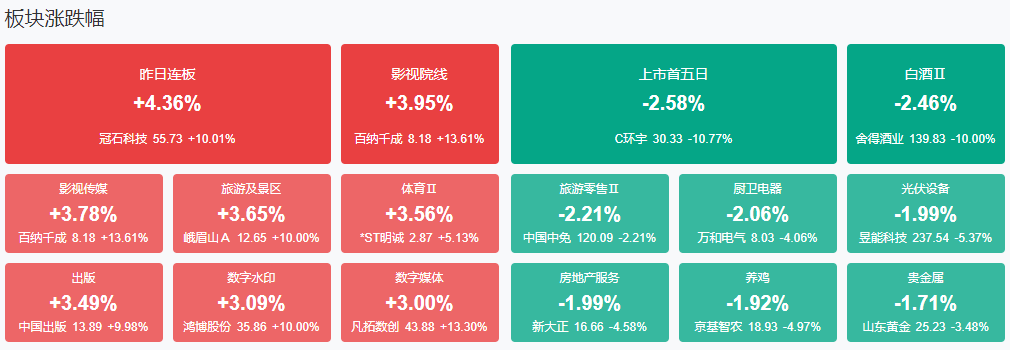 板块方面,旅游、传媒、通信服务、手机游戏等板块涨幅居前,家电、猪肉、白酒、CRO等板块跌幅居前。