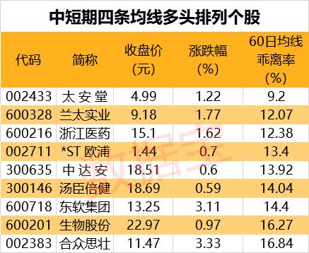 截至周一收盘,119只个股5日、10日、20日、60日四条均线近日呈多头排列。其中太安堂、兰太实业、浙江医药股价与60日均线的乖离率最小,分别为9.20%、12.07%、12.38%。