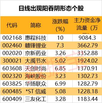 值得注意的是,惠程科技、赣锋锂业、京新药业等个股主力资金净流入最多,分别达到9084.3万元、3662.79万元、3352.88万元。