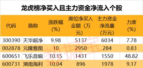 速看!龙虎榜净买入且主力资金净流入个股一览