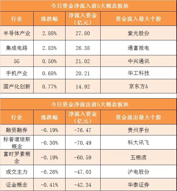 概念板块方面,今日半导体产业、集成电路、5G、手机产业等概念板块资金呈现净流入,其中半导体产业概念净流入27.8亿元居首。