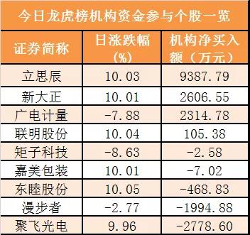 盘后龙虎榜数据显示,机构现身9股,其中立思辰等4股呈现机构资金净买入,聚飞光电等5股呈现机构资金净卖出。